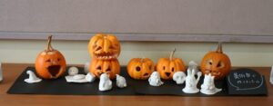 小金井二中では、先週音楽祭が行われましたが、今回は校舎内に潤いを与えてくれている芸術作品を紹介します。美術部員が制作した「ハロウィンかぼちゃと仲間たち」です。