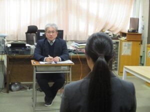 小金井第二中学校では、3年生全員を対象に面接練習を行っています。義務教育修了後、新たなステージへと歩みを進めていく前に、中学校3年間でどのようなことを学んだのか、成長したと感じられたことはどんなことなのかを聞き、自分の言葉で語ってもらっています。今回チャレンジする入学者選抜のために行っているという一面もありますが、中学校を卒業する前に、今の自分を振り返り、等身大の自分を飾らず、気取らずに語るという経験は、義務教育修了のいわば卒業試験という意味もあると捉えています。