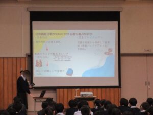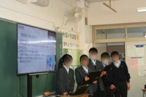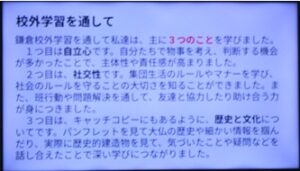1年生は「鎌倉校外学習」での班活動を通じて得た体験と、実体験を通して深めた知識の成果を班ごとにキャッチフレーズとしてまとめ、スライドを使ってプレゼンテーションをしました。