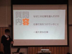 2年生は「職場体験」での体験活動を通じて、実際に事業所に行き、働くことを通して初めてわかった社会とつながることの楽しさややりがい、難しさや自分自身の課題などについて、個人で発表しました。