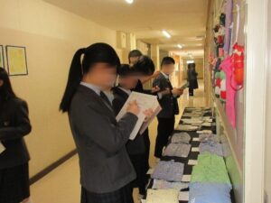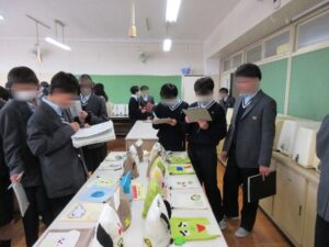 1月15日(木)に教科展示の見学会がありました。1学期から今までの授業の中で制作した作品や学びを各学級、各学年で校舎内の壁面や教室に展示し、鑑賞しました。