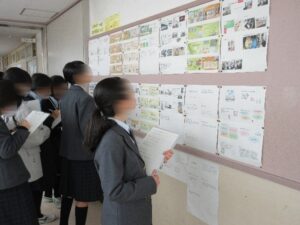 1月15日(木)に教科展示の見学会がありました。1学期から今までの授業の中で制作した作品や学びを各学級、各学年で校舎内の壁面や教室に展示し、鑑賞しました。